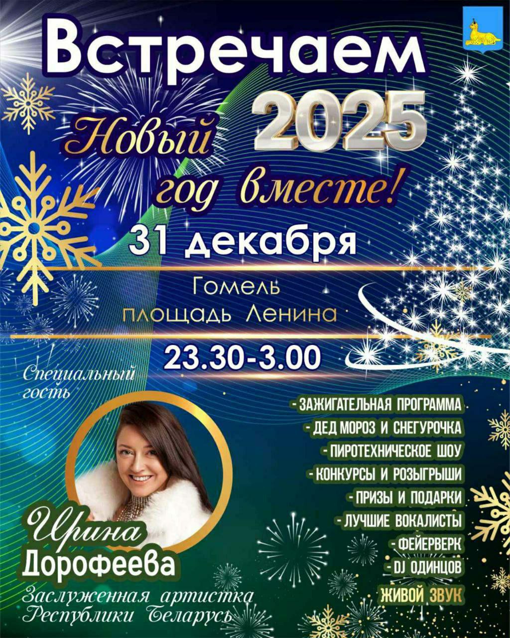 Гостей и жителей города Гомеля ожидает концертно-развлекательная программа с участием ведущих артистов города Гомеля и Заслуженной артистки Республики Беларусь Ирины Дорофеевой.