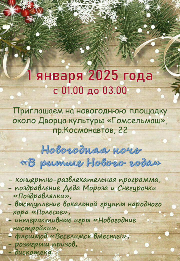 🎄🎉Площадь около Дворца культуры «Костюковка», ул.Незалежности, 2а — с 01.00 — 02.30;