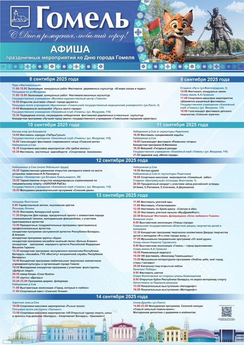 💥💥💥Гомель встречает свой 883-й день рождения с размахом, достойным его богатой истории и яркого настоящего. Фестивальная неделя обещает стать настоящим калейдоскопом событий: от спортивных состязаний и уличных перформансов до масштабных концертов. На сценах города выступят любимые артисты белорусской, российской и советской эстрады, а творческие коллективы подарят зрителям незабываемые эмоции.