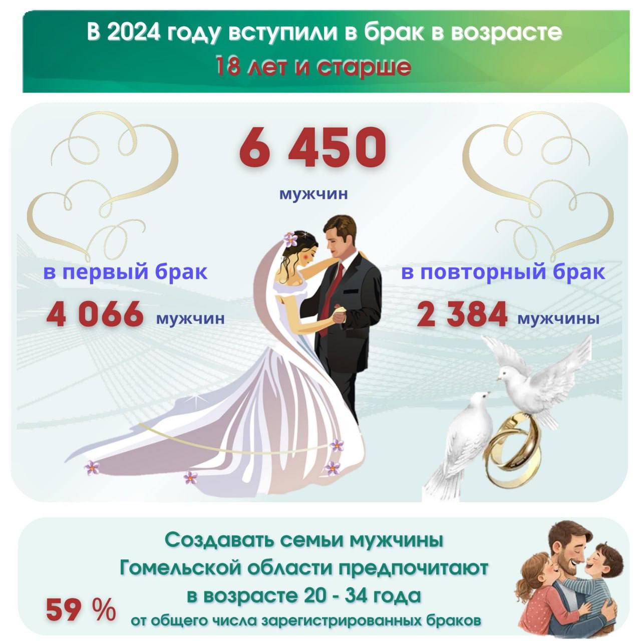 В 2024 году в брак вступили 6450 мужчин, более двух тысяч из них – повторно. Создавать семьи мужчины предпочитают в возрасте 20-34 года.