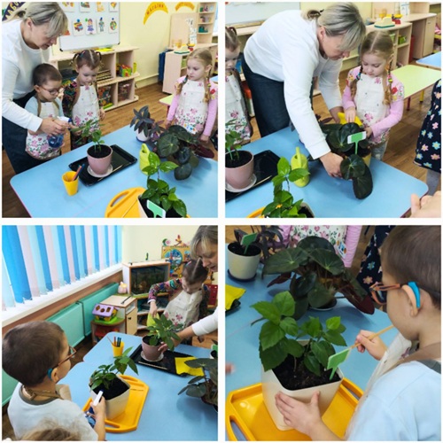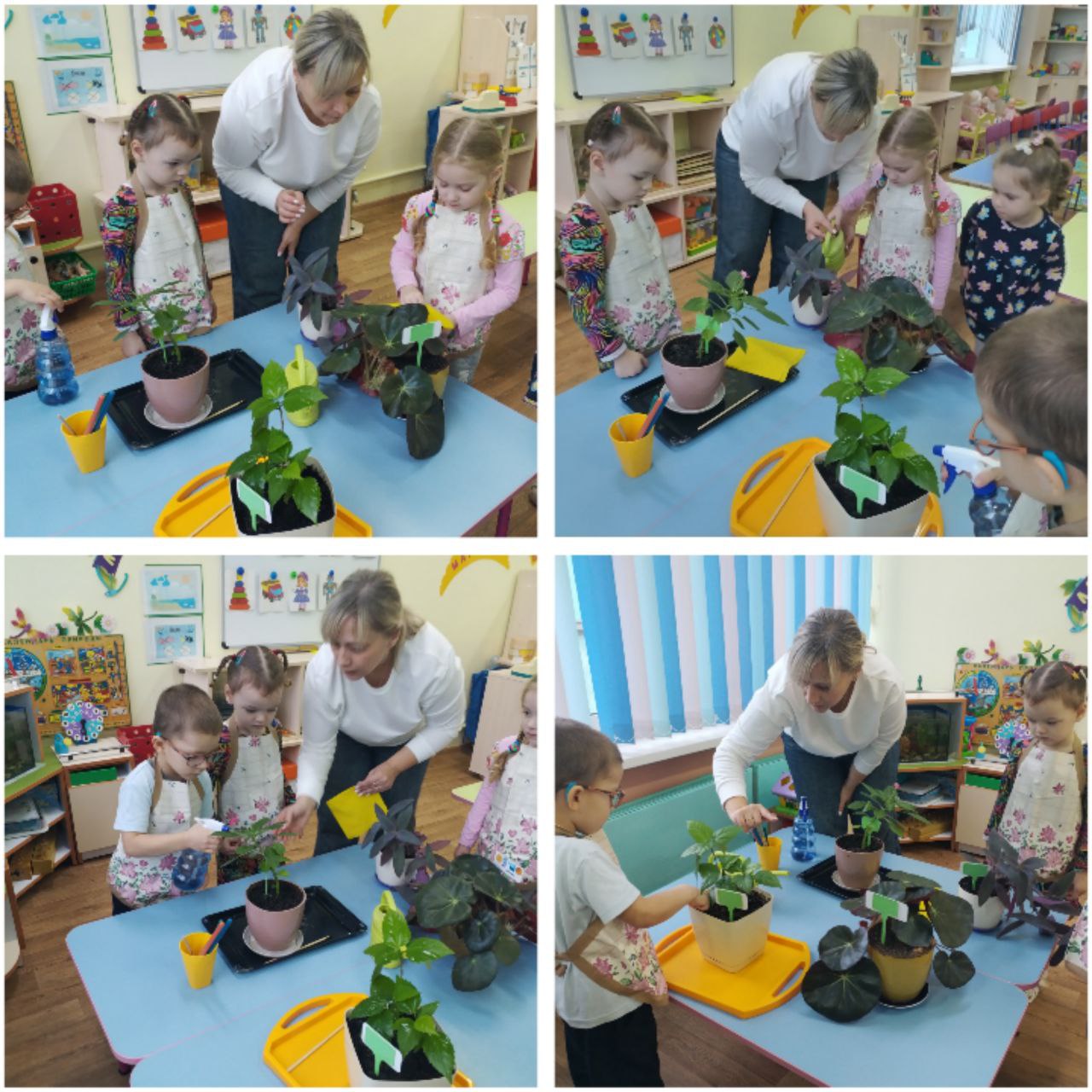 Сегодня наши маленькие помощники трудились в уголке природы:поливали цветы, протирали листочки и рыхлили землю.